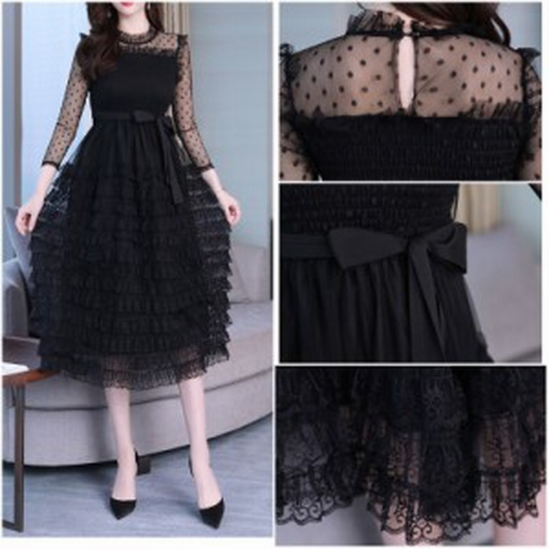 プチドットのシースルーがおしゃれな黒の長袖aラインワンピース カジュアルドレス